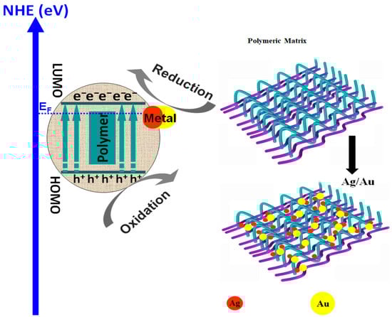 Polymer/metal composites are often viewed as suitable materials for the photocatalytic removal of persistent organic pollutants, such as dyes or different pharmaceutical compounds. As presented in Figure 5, the metal nanoparticles penetrate the polymeric matrix and provide a compatible interfacial region. When conductive polymers are used, the composite materials which act as Schottky junctions represent the interface between the metal component and the semiconductor structure, providing an effective pathway to decrease the photo-generated carrier’s recombination and even to increase the catalyst spectral absorption.