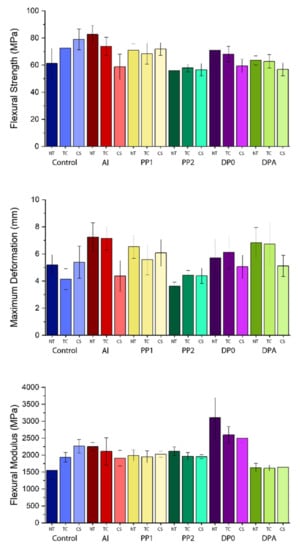 The pairwise comparisons revealed that the thermal treatment and chewing simulation caused the flexural strength of the control specimens to increase significantly compared to the non-treated ones. Conversely, each treatment on the Al groups exhibited a significant decrease in flexural strength (p < 0.05). The treatments did not exhibit any significance for the remaining mesh reinforcement groups, except for chewing simulation on the DP0 group, in which the flexural modulus decreased (p < 0.05).