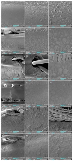 SEM images with different magnifications were collected from the surfaces of the fractures, which belong to the three-point bending test specimens for the control and mesh reinforcement groups. The SEM images of fracture surfaces with three different magnifications (100×, 250×, and 500×) for each test group are presented in Figure 3.