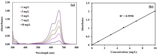 (a) Wavelength–absorbance curves and (b) calibration curve of methylene blue aqueous solutions.