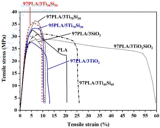 Stress–strain curves of PLA, PLA/TiO2, PLA/SiO2, PLA/TixSiy, and PLA/TiO2SiO2 composites.