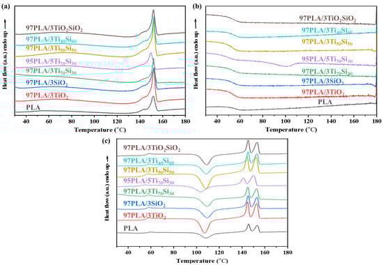 DSC thermogram of (a) first heating, heating rate 5 °C/min, (b) cooling, cooling rate 5 °C/min, (c) second heating, heating rate 5 °C/min of PLA, PLA/TiO2, PLA/SiO2, PLA/TixSiy, and PLA/TiO2SiO2 composites.