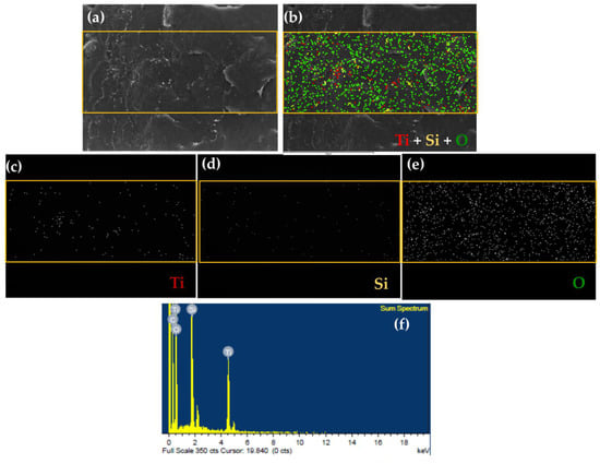The EDX elemental mapping results (Figure 6b–e) suggested the existence of TixSiy mixed oxides in the PLA composites. Furthermore, EDX elemental analysis results (Figure 6f) of the selected area also confirmed the spatial distribution of the Si, Ti, and O elements of the TixSiy mixed oxide in the PLA composite. The distribution of Si and Ti in the particles was relatively uniform in the case of the PLA/3Ti70Si30 composite.