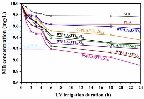 Concentration of methylene blue (MB) due to absorption of PLA, PLA/TiO2, PLA/SiO2, PLA/TixSiy, and PLA/TiO2SiO2 composite films under UV irrigation.