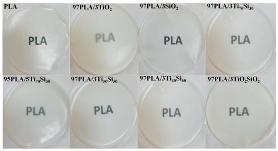 Photographs of films prepared from PLA, PLA/TiO2, PLA/SiO2, PLA/TixSiy, and PLA/TiO2SiO2 composites (250 ± 4.68 µm thickness).