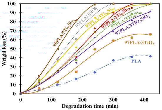 Figure 10 shows the percentage weight loss of PLA and PLA composite films as a function of hydrolytic degradation time. Complete degradation of PLA was achieved at about 1200 min, while all of the PLA composite films were hydrolyzed faster than neat PLA. Interestingly, the incorporation of 3 wt.% of TiO2, SiO2, Ti70Si30, Ti50Si50, Ti40Si60, and TiO2SiO2 exhibited a much higher weight loss as a function of time than neat PLA. The presence of filler induced a much more apparent change of weight loss of hydrolytic degradation, which indicates the enhancement of a hydrolytic degradation ability of the PLA matrix. This was attributed by the addition of nanoparticles, which helped accelerate the hydrolytic degradation of the PLA matrix. Furthermore, 97PLA/3TiO2, 97PLA/3SiO2, 97PLA/3Ti70Si30, 97PLA/3Ti50Si50, 97PLA/3Ti40Si60, and 97PLA/3TiO2SiO2 were fully degraded at 840, 300, 420, 420, and 560 min, respectively. Moreover, the PLA composite containing 5 wt.% of Ti70Si30 degraded faster than all the composites and it was fully degraded in approximately 240 min. Consequently, it could be concluded that the rate of the hydrolytic degradation of PLA composite films can be controlled by the filler content. This result is in agreement with Buzarovka and Grozdanov (2012) [].
