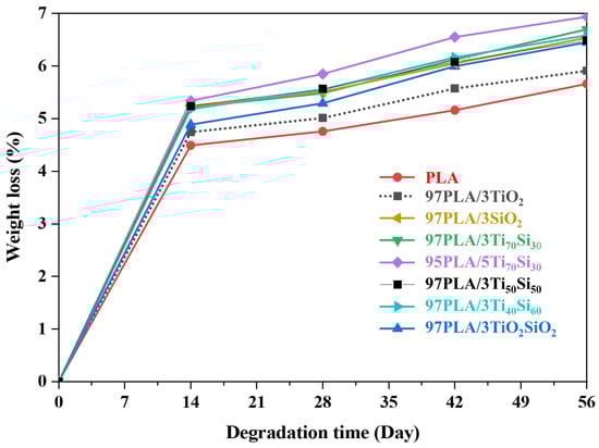 Weight loss of PLA, PLA/TiO2, PLA/SiO2, PLA/TixSiy, and PLA/TiO2SiO2 composites films after different periods of in vitro degradation.
