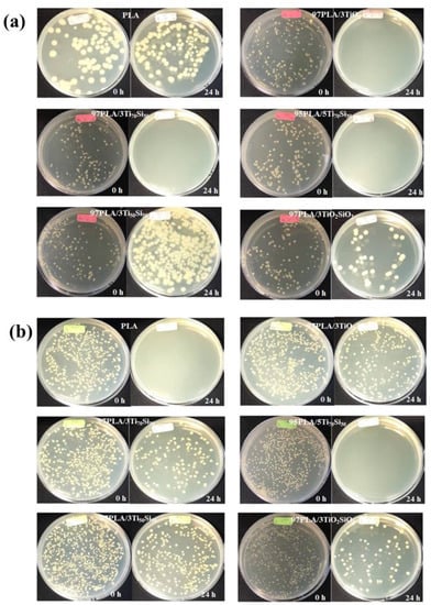 The number of (a) bacteria Escherichia coli and (b) bacteria Staphylococcus aureus on PLA and PLA composite films at time 0 h (at dilution 10−3) and 24 h (at dilution 100).