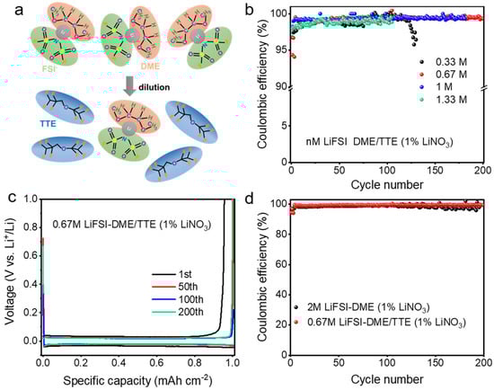 | LiFSI-DME/TTE | 0.67 M | 99.3%, 200 cycles,0.5 mA cm−2, 1 mAh cm−2 | This work |