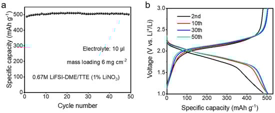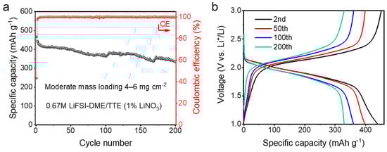 | Cu||Li2S | 70% retention over 100 cycles at 0.1166 A g−1 | 4 mg cm−2 | [58] |