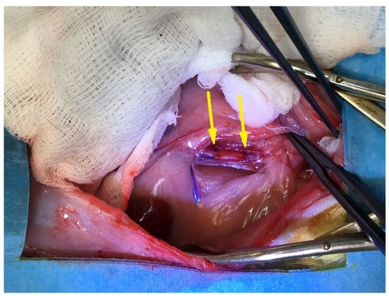 When the surgical stage of narcosis was reached, basic midline laparotomy was performed. First, 0.5% lidocaine (1 mL) (Dalhimpharm, Khabarovsk, Russia) was poured intraperitoneally. If muscular contractions of the abdomen occurred, the dosage of lidocaine was increased up to 3 mL as necessary. The intestine was moved out, washed with 9% NaCl solution (Solopharm, St. Petersburg, Russia) and wrapped in a sterile wet gauze. The abdominal aorta was dissected from the renal arteries down to the bifurcation. At this time point, Fraxiparine (25 IU) (Aspen Notre-Dame-de-Bondeville, Notre-Dame-de-Bondeville, France) was injected subcutaneously. After a two-minute pause, full aorta occlusion was performed: the upper clip was placed past the renal arteries, and the lower clip was placed above the bifurcation. A 5 mm section of the abdominal aorta was excised and an end-to-end anastomosis between the aorta’s upper section and a PCL graft (5 mm length × 2 mm in inner diameter) was performed. The same anastomosis was conducted on the lower section; both used an Optilene 8/0 thread (Braun, Rubi, Spain) (Figure S2). Cefazoline (1 mg/kg) (Biosintez, Penza, Russia) was administered in solution intraperitoneally. The operation wound was closed with a monofilament Optilene 5/0 thread (Braun, Rubi, Spain), and the cutaneous suture was swabbed with povidone-iodine solution.