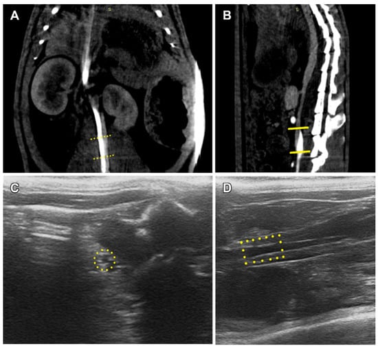 Figure 3. Functional diagnostic images of implanted graft, 90 days after implantation. CT, coronal section (A); CT, sagittal section (B); ultrasonic image, cross section (C); ultrasonic image, sagittal section (D). Yellow frames mark graft position.