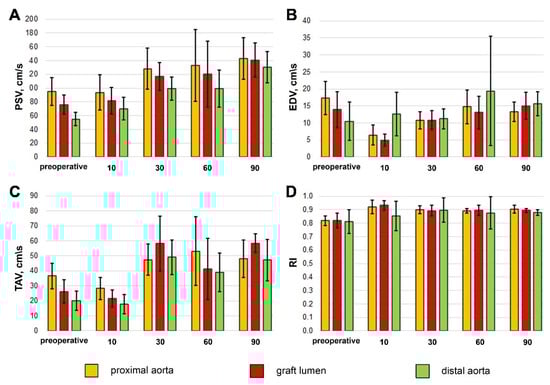 Before the procedure, all of the animals were sedated with dexmetamidine, the abdominal area was shaved with a veterinary trimmer and then the Mediagel ultrasound gel (Geltek, Moscow, Russia) was applied. The ultrasound procedures and Doppler measurements were carried out using a Philips CX50 portable vascular ultrasound machine (Philips, Bothell, WA, USA) with a linear transducer. Peak systolic (PSV), end diastolic (EDV) and time average (TAV) blood flow velocities were measured at three topographic points such as in the abdominal aorta above the proximal anastomosis, and at the midline of the graft and abdominal aorta between the distal anastomosis and bifurcation. The resistance index (RI) was calculated for each animal as: