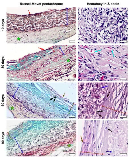 Figure 5. Histological picture of samples by follow-up period. Russell–Movat pentachrome staining, magnification—×100, bar—50 µm, H&E staining, magnification—×400, bar—20 µm. The red arrows indicate luminal surface, red lines—intimal hyperplasia, dark blue lines—PCL graft, green stars—adventitia, turquoise arrows—neoangiogenesis, black arrows—chondroid metaplasia.