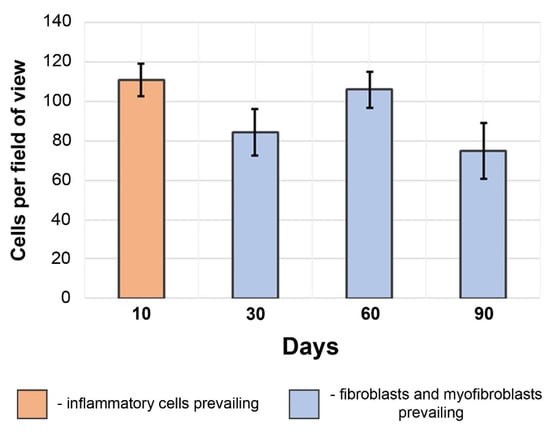 Figure 6. Scaffold cellularity dynamics. The predominant cell types are different: inflammatory cells (10 days) or fibroblasts and myofibroblasts (30–90 days). The results are given as mean and standard deviation (σ).