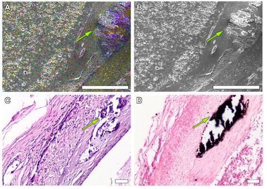 Figure 7. SEM element analysis of the calcification that developed under the layers of endothelial tissue and intimal hyperplasia at 60 days after implantation. The blue points indicate phosphorus, yellow—oxygen, bright pink—calcium, bar—250 µm (A). Overall SEM image of crystal clusters, bar—250 µm (B). H&E image of mineralization point, magnification—×100, bar—50 µm (C). von Kossa staining of mineralized area, black staining indicates presence of calcium, magnification—×100, bar—50 µm (D). Green arrows indicate crystal clusters.