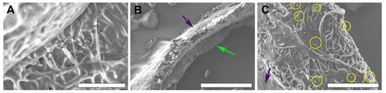 Figure 8. SEM image of a dried graft section at 90 days after implantation. Fiber thinning, bar—50 µm (A); graft wall, bar—500 µm (B); cellular infiltration, bar 100—µm (C). The dark purple arrows are luminal surface, green arrow is adventitial surface, yellow circles enclose migrating cells.