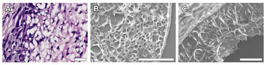 Figure 9. Comparative images of the samples explanted at 90 days after implantation. Paraffinized H&E stained section, light microscopy, magnification—×400 (A), SEM images of deparaffinized section (B) and dried section of the same sample, magnification—×600 (C).