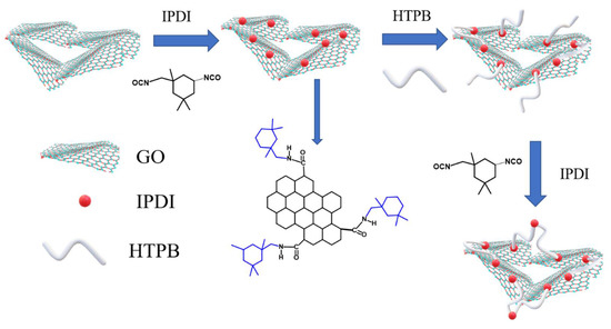 As illustrated in Figure 1, the preparation method of the IGO/HTPB (IGH) composite is as follows: (1) A quantity of IGO (0, 0.3, 0.5, 0.7 wt%) was uniformly dispersed and mixed with HTPB prepolymer by mechanical stirring. (2) The mixture was placed in an oil bath at 80 °C for 3 h to obtain the IGO cross-linked polymer network. (3) IPDI was introduced at a curing factor R = 1.3, and then the well-mixed mixture was poured into a 100 mm × 100 mm × 3 mm mold. (4) Finally, the mold was placed in a vacuum oven, cured at 80 °C for 36 h to obtain the IGH composites.