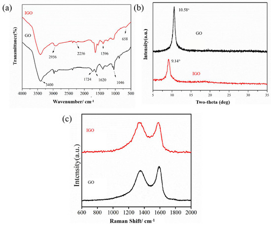 The FTIR spectra of GO and IGO are presented in Figure 2a. The characteristic peaks of GO appeared at 3400, 1620 and 1734 cm−1, which correspond to the stretching vibrations of -OH, C=C and C=O, respectively. After being functionalized by IPDI, IGO showed new absorption peaks at 1640 cm−1 (C=O stretching vibration), 1391 cm−1 (C-N stretching vibration), and 658 cm−1 (N-H bending vibrations), confirming the formation of -NH-CO-, which were attributed to reaction between isocyanate groups (-NCO) of IPDI and carboxylic or hydroxyl groups of GO. In addition, there is a characteristic peak at 2256 cm−1 (-NCO), indicating the successful introduction of -NCO on GO surface.