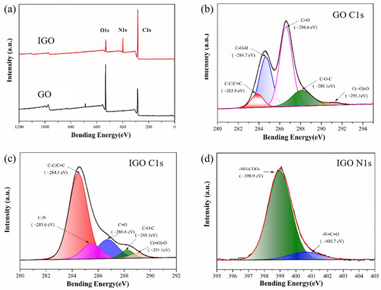 (a) XPS survey spectra of GO and IGO. (b,c) High-resolution C1s XPS spectra of GO and IGO, respectively. (d) High-resolution N1s XPS spectra of IGO.
