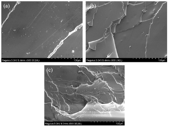 The dispersion of the filler in the matrix greatly affected the performance of the composites. We use SEM to further investigate the dispersion of the IPDI in the composites. Figure 4a–c shows the SEM images of IGH composites with different IGO content. Some layered structures can be seen in the fracture surface with the increasing IGO content; the appearance of cracks on the fracture surface means the enhancement of interfacial interaction, indicating an enhance in the hardness and rigidity of the composites. As shown in Figure 5, IGO particles uniformly dispersed in the matrix. Consequently, the homogenously dispersed IGO could create a positive effect, restricting the pathway of plasticizer diffusion.