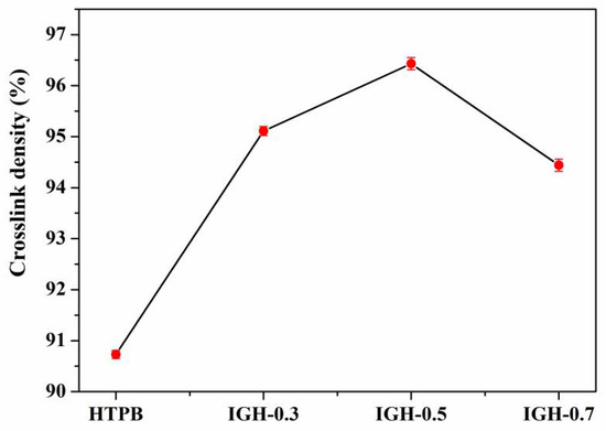 Among the IGH composites liners, the crosslink density of pure HTPB is the lowest, and the crosslink density of the IGH composite liner was increased with the IGO. IGH-0.5 has the highest crosslink density of 96.43%, increased by 5.71%. As shown in Figure 7, the -OH group of HTPB chain and the -NCO of IPDI form a stable cross-linked structure during the curing and molding process. There are many oxygen-containing groups on the surface of GO, and some isocyanate groups on the curing agent react with these hydroxyl groups. For IGH liner composite, IGO is modified by IPDI, so that there is a large number of -NCO groups that can react with the hydroxyl groups of the HTPB chains to form a multi-crosslinked structure. Therefore, IGO is no longer simply dispersed in the matrix, but acts as a cross-linking agent to form a cross-linked structure with HTPB, so that the crosslink density is increased.