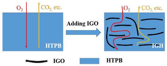 In this study, we combined the excellent barrier effect of GO with the cross-linked structure of HTPB to prepare an anti-migration composites liner. The IGO filled HTPB composites (IGH) with a cross-linked structure were prepared by cross-linking IGO with HTPB chains. The contribution of IGO to the anti-migration and ablation resistance performance of the IGH composite liner were mainly investigated. Moreover, the mechanical properties, crosslink density, and filler dispersion of HTPB was also evaluated.