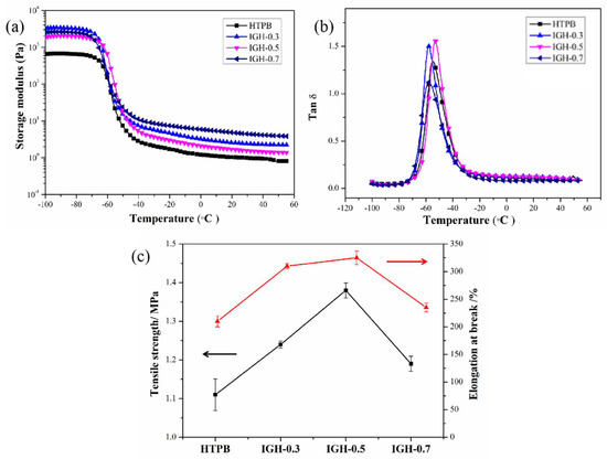 Storage modulus (a) and Tan (δ) (b) vs. temperature of IGH composites, (c) Mechanical properties of IGH composites with different IGO contents.