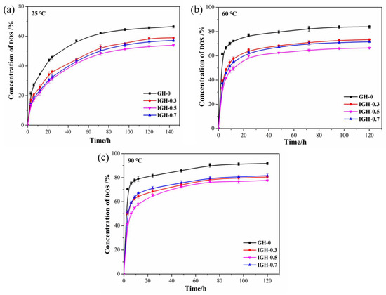 The migration curves of DOS in the IGH composites at different temperatures: (a) 30 °C, (b) 60 °C, and (c) 90 °C.