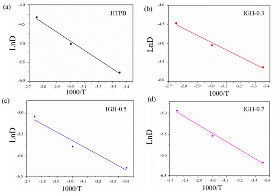 The plots of lnD against 1000/T at different temperatures for different samples: (a) HTPB, (b) IGH-0.3, (c) IGH-0.5 and (d) IGH-0.7.