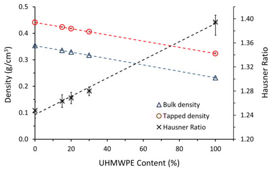 Figure 3). This suggests that the AC powder has high flow and the addition of AC improved the flow of UHMWPE (original HR = 1.39). This improvement was observed during the spreading and distribution of the powder in the laser-sintering machine. It is evident that the HR does not strictly follow the “rule of mixtures”, in that it is not a simple linear relationship with regard to concentration. This is probably due to the increased AC-AC particle contact.
