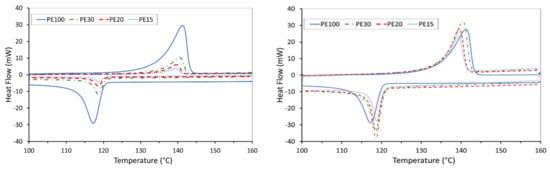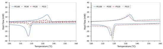 Figure 10 shows that the enthalpy of melting and, therefore, the calculated crystallinity of the first heating cycle, slightly increased with the decrease in the mass fraction of activated carbon.