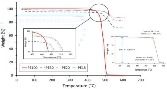 The extrapolated onset temperature, which refers to the temperature at which the weight loss begins, is the intersecting point of two lines drawn tangent to the two linear regions of the TGA curve. The onset temperature was used for consistency. This temperature is also recommended by both ASTM E1131 and ISO 11358 standards. The delta Y, the change in mass, was used to measure the “as run” sample and determine the mass fractions of each phase.
