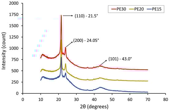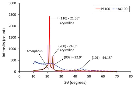 41]. The sharp peaks in (110) and (200) crystal planes were 21.5°, 21.5°, 21.55° and 24.05°, 24°, 24° for PE30, PE20 and PE15, respectively, The XRD profiles of the AC/UHMWPE composites show a new weak and wide diffraction peak near 2θ = 43.0°, which is assigned to the (101) diffraction planes of graphitic carbon coming from activated carbon and confirming its amorphous state [