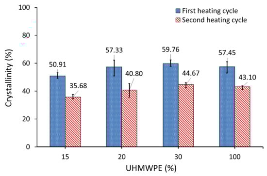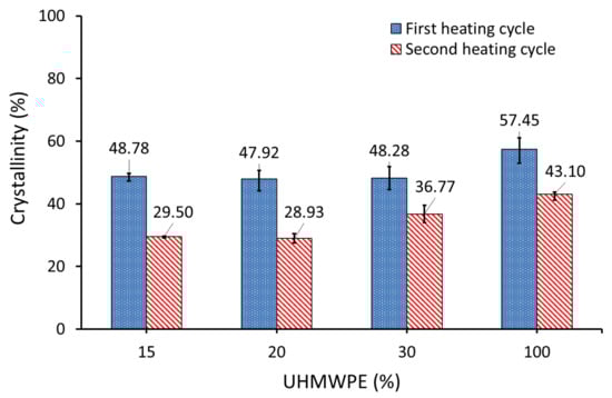 Figure 11 shows that the degree of crystallinity of AC/UHMWPE composites did not change in the first heating cycle with the change in the mass fraction of activated carbon. This result confirmed our initial prediction regarding the crystallinity behaviour of untreated AC/UHMWPE composites. Silicon oil was chosen as it does not mix with UHMWPE and is not expected to change crystallisation. However, the degree of crystallinity in the second heating cycle of AC/UHMWPE composites decreased with the increasing mass fraction of activated carbon.