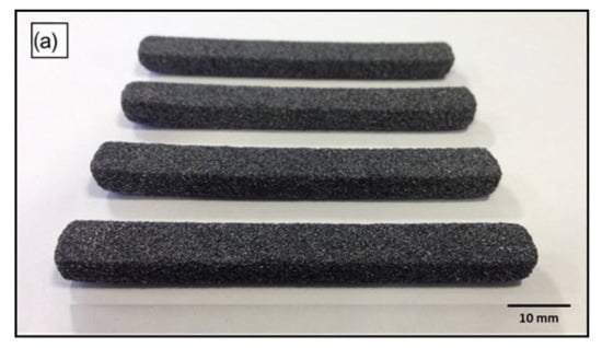 The TGA results revealed that the onset of mass loss shifted to considerably higher temperatures for the AC/UHMWPE composites. For the composites containing 15 and 20% of UHMWPE, this shift was around 20 °C. This suggests that the thermal stability of the AC/UHMWPE increased with the increase in the content of the activated carbon. Activated carbons can preferentially adsorb the volatile degraded UHMWPE components during the degradation process. This could delay the mass loss and/or retard the thermal degradation, resulting in a higher perceived degradation temperature for the composites compared to that of the neat UHMWPE. The result clearly shows that the temperature window from DSC and TGA is sufficiently wide and favourable for laser sintering.