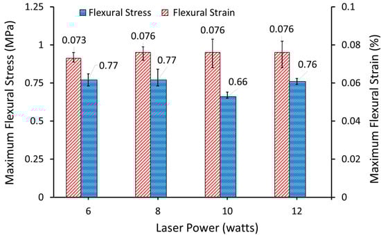 The results suggest that the flexural stress remains unchanged within a laser power range between 6 and 12 watts. However, a slight drop in flexural stress can be observed at laser power of 10 watts and which is likely due to statistical variation.