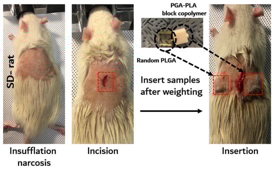 The in vivo degradation test was reviewed and approved by the Institution Animal Care and Use Committee (IACUC) of Sungkyunkwan University, School of Medicine (SUSM) (Approval No. SKKUIACUC2019-08-21-1). 3Rs, Replacement of animals by alternatives wherever possible, Reduction in number of animals used and Refinement of experimental conditions and procedures to minimize the harm to animals were ensured in this in vivo degradation test. For investigating biodegradation behaviors, synthesized PGA–PLA block copolymers and commercial PLGA random copolymer (as a control group) were inserted in the Sprague Dawley rats’ (SD-rat, n = 3, 8 weeks old, Orient Bio Inc., Seongnam, Korea) intradermal back skin (Figure 2).