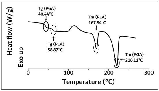 As a result of DSC analysis in Figure 3, the Tg and Tm of the PLA moiety in block copolymer were 58.87 °C and 167.84 °C, and those of PGA were 40.44 °C and 218.11 °C, respectively.