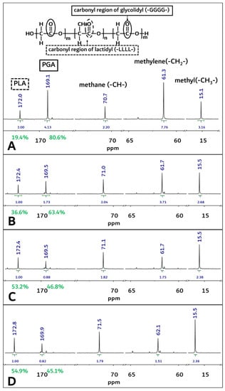These results were concurrent with recently reported papers [6,8,10,11,12]. The molecular weight of the polymerized PGA–PLA block copolymer was confirmed to be 159,000 (Mw) by GPC data analysis (PDI: 2.04, data not shown). Because of the molecular-weight increment in this study (inherent viscosity: 1.22 dL/g (25 °C, 0.5 g/dL, Hexafluoroisopropanol (HFIP))), the flexural strength of the newly synthesized PGA–PLA block copolymer was also increased to 137 MPa compared to relevant data in our previous report [6,10]. The copolymer’s mole-fraction ratio of PGA/PLA was determined by 13C-NMR spectroscopy and summarized in Figure 4.