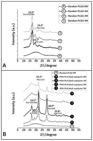 In Figure 5A,B, the broad peaks between 16° and 23° in the random PLGA polymer 0M (as control sample) indicate the amorphous region [13]. However, in the PGA–PLA block copolymer, semi-crystalline PLA block peak according to (I110/200) weakly appeared at 16.5°, and crystalline PGA block peaks according to (I110, I020) and (I121) are shown in 22.2°, 28.9°, and 35.8°, respectively [14,15].