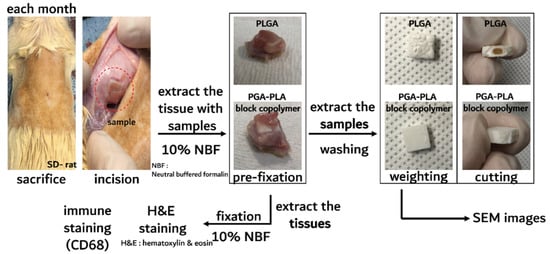 The surrounding tissues of the PGA–PLA block copolymer specimens in the back sites of the SD rats were subjected to fixation procedures with paraffin for biopsy sample. Extracted tissues around the samples were fixed by 10% neutral buffered formalin (NBF, BN-019, Biosesang Co., Ltd., Seungnam, Korea). Fixation was performed after more than 2 days, and the NBF solution was refreshed every day. Next, fixed tissues were trimmed by razor and dehydrated by ethanol and xylene, respectively. The staining process for histochemical analyses was conducted using hematoxylin and eosin and CD-68 antibody (Thermo Fisher Scientific, Rockford, IL, USA) to detect the nuclei of the associated macrophages owing to foreign-body reaction. Digital images of the paraffin-embedded tissue sections were obtained using slide scanner scope (Aperio ScanScope® CS system, Leica Biosystems, Wetzlar, Germany).