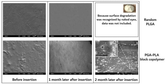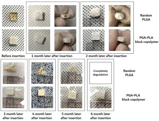 In the case of random PLGA, the PGA moiety was rapidly degraded and quickly disappeared through its own crystalline characteristics over the course of the biodegradation time, but the semi-crystalline PLA moiety showed relatively slow degradation behavior and maintained its characteristics over the 3-month in vivo biodegradation test [16,17,18].