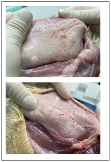 The PGA–PLA block copolymer and PLGA random copolymer cube-type implantation specimens (10 × 10 × 4 mm, length×width×height) for the in vivo test were produced using an injection-molding device (Mini Molder BA-915A, Bautek Co. Ltd., Pocheon, Korea) under processing temperatures between 220 °C and 240 °C and were sterilized by ethylene-oxide gas before implantation. Sample insertion was conducted under insufflation narcosis using isoflurane (0.5–2.0%) with O2 gas for the fixation process. After inserting the specimens, the incision site was sutured by nonabsorbable EZ clip wound closures (Stoelting Co., Wood Dale, IL, USA). Furthermore, 40 mL/kg of Metacam® (Boehringer Ingelheim Co., Ingelheim am Rhein, Germany) was subcutaneously injected once per day for pain management.