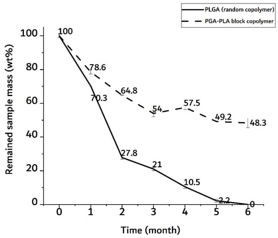 The PGA–PLA block copolymer sample, on the other hand, showed a decrease in weight of up to 50 wt% in a 6-month implantation sample. In the random PLGA, their rapid decrease in thermal stability and their own weight were caused by the bulk degradation mentioned above [9]. And the meaningful differences time-depending degradation behavior of PGA-PLA block copolymer. (Appendix A, Figure A1)