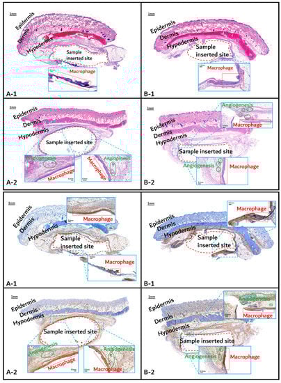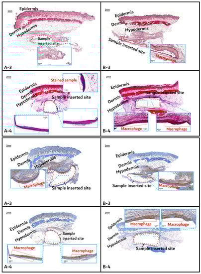Initial granulomatous inflammation and fibrous encapsulation were observed at an early stage of insertions up to 2 months (Figure 11). This phenomenon was closely related to rapid surface swelling (leading to surficial erosion and hydrolysis) by water absorption [24,25]. Furthermore, the shape of the inserted random PLGA sample changed to oval, which caused sample swelling. Both copolymers showed signs of recovery due to the elimination of angiogenesis (one of the processes contributing to inflammation) in the 3M and 4M samples. The tissues around the inserted random PLGA sample (Figure 11, Figure 12 and Figure 13(A-1 to A-6)) exhibited mild inflammation from the initial stage until 2 months. Additionally, inflammation by any macrophage, angiogenesis, or giant cell were not observed in the samples up to 3 months after the insertions [26]. Since the random PLGA samples were rapidly degraded and swelled, fewer stimuli caused by foreign-body reactions were reported [27,28].