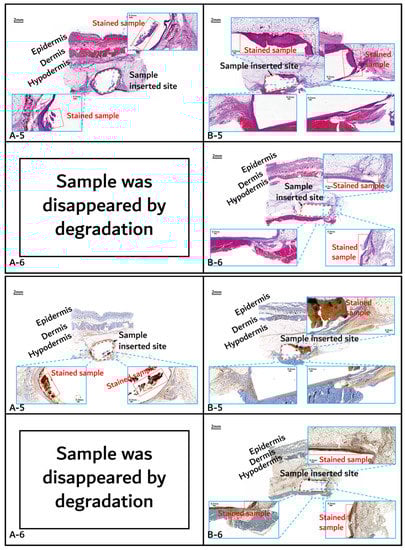 On the other hand, the tissues around the inserted PGA–PLA block copolymer sample (Figure 11, Figure 12 and Figure 13(B-1 to B-6)) exhibited mild inflammation until 4 months after insertion. The PGA–PLA block copolymer showed slow degradation, slow swelling behavior, and fewer stimulated tissues, causing surface erosion, for 4 months (Figure 13(B-4)). This phenomenon was caused by the slow degradation of the surface erosion. Bulky hydrolysis was postponed in the following stage of degradation and the inserted sample’s rectangular shape was preserved for up to 6 months. Block copolymer, which is difficult to hydrolyze and residues with relatively high bulk molecular weights were the causes of the inhibition of the degradation. However, the random PLGA containing tissue after 6 months was not visible in the biopsy specimen because of its complete degradation (Figure 13(A-6)) [6].