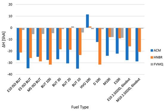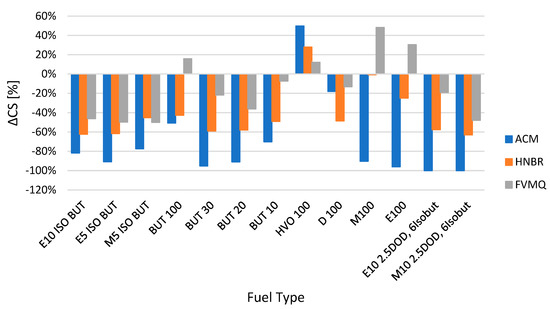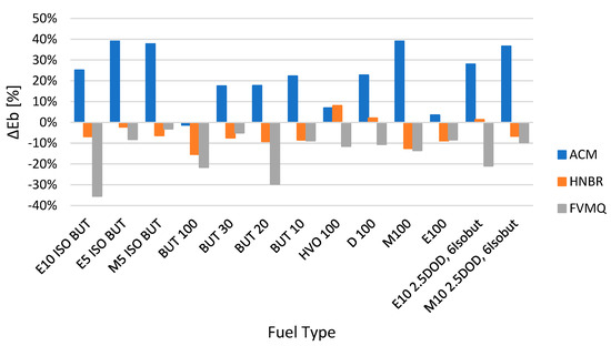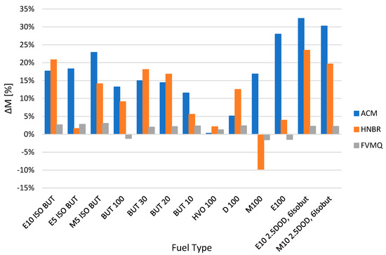 - The mass change due to the effect of the tested pure and blended fuels was minimal for the FVMQ type O-rings. The values were almost constant, with the change in mass ΔM ranging from −1.5% to 3%. The change in mass was more pronounced for the ACM and HNBR O-rings, with a change in mass ΔM of −9.7% to 32.4%. These O-rings are less compatible with the fuels tested. In particular, the HNBR type O-rings, and especially the ACM type O-rings, experienced significant losses, especially for the fuels M100, M5 ISO BUT, E100, E10 2.5DOD 6Isobut, M10 2.5DOD 6Isobut and E10 ISO BUT.