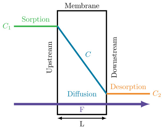 Sketch of the three-step process of mass permeation flow F through a dense polymer membrane with thickness L: sorption at the upstream side of the membrane with as boundary condition for Equation (4), diffusion through the membrane with the concentration distribution C inside the membrane, and desorption at the downstream side of the membrane with as the boundary condition.